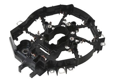 特に、精密インサート射出成形事業において、成形難易度が高いと言われている耐熱性が高い樹脂(PPS材)に複雑な電気回路(フープ材)を組込む部品の成形を得意としています。